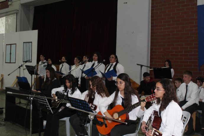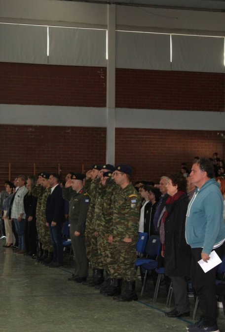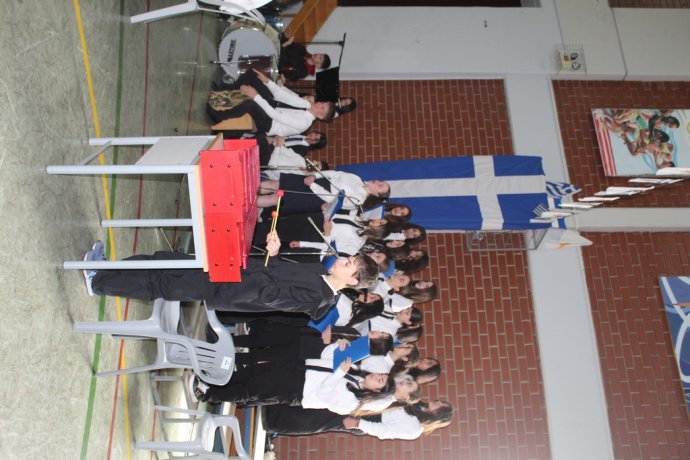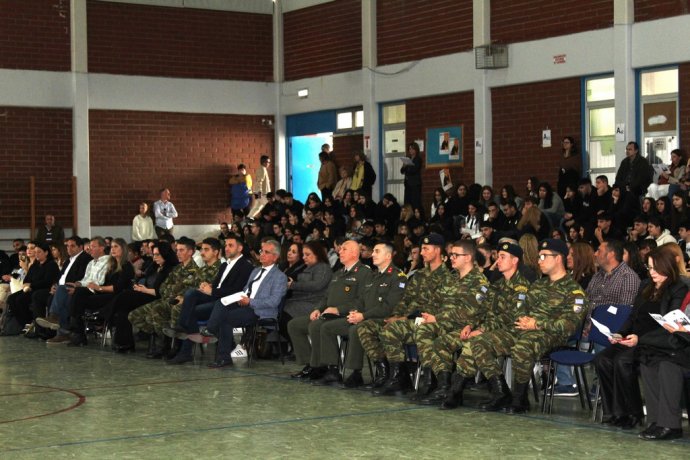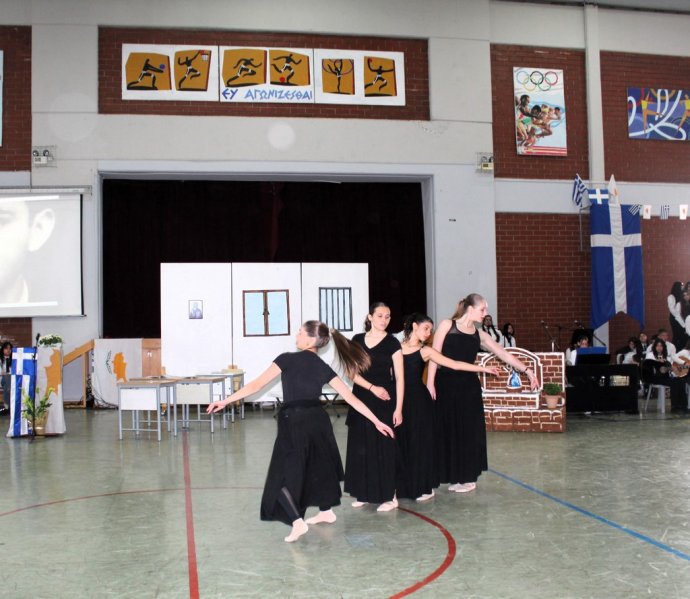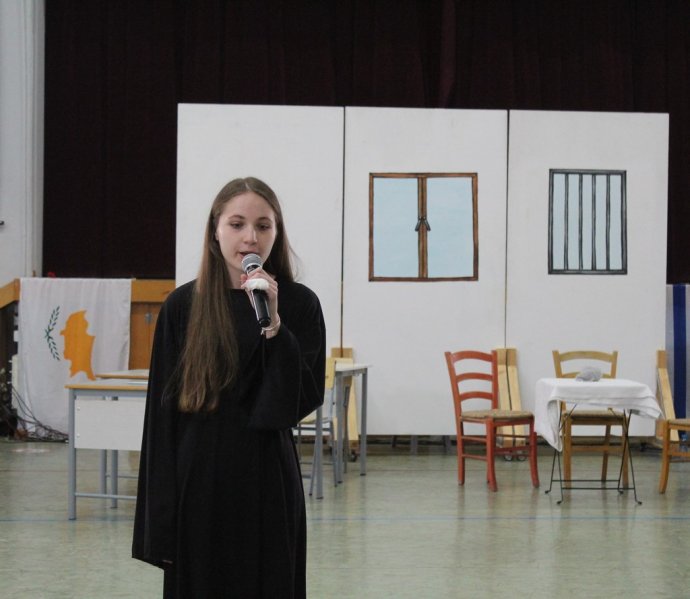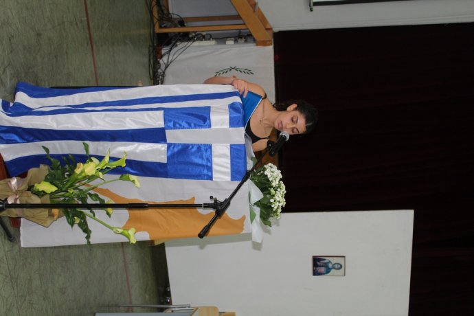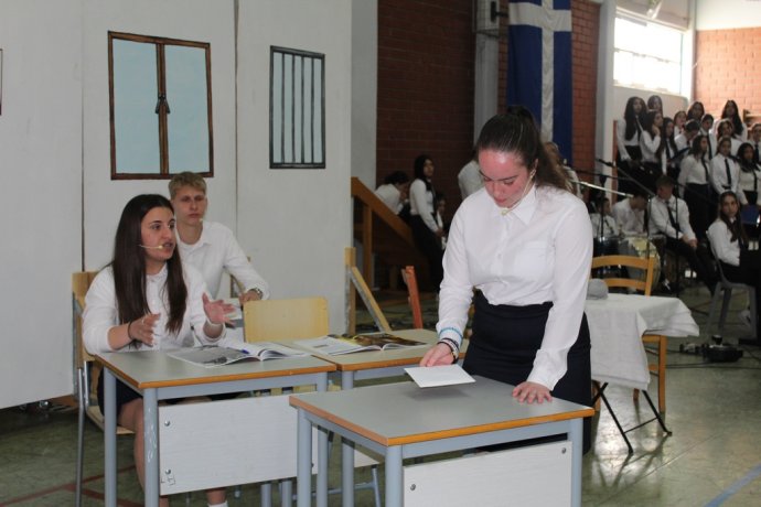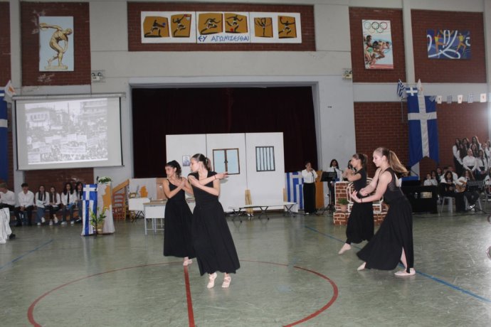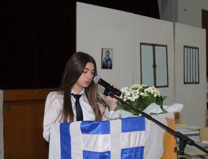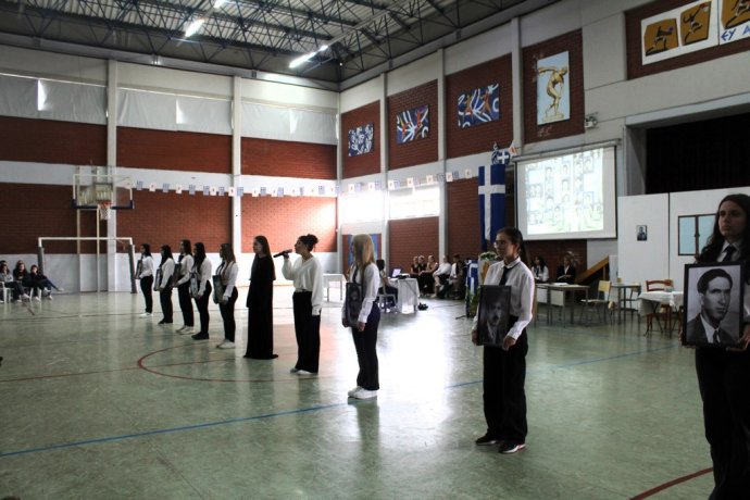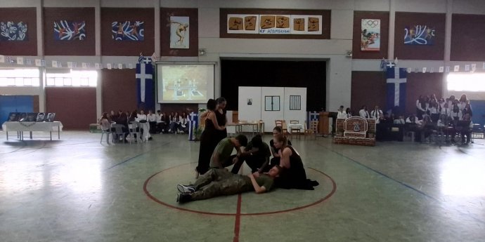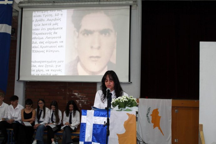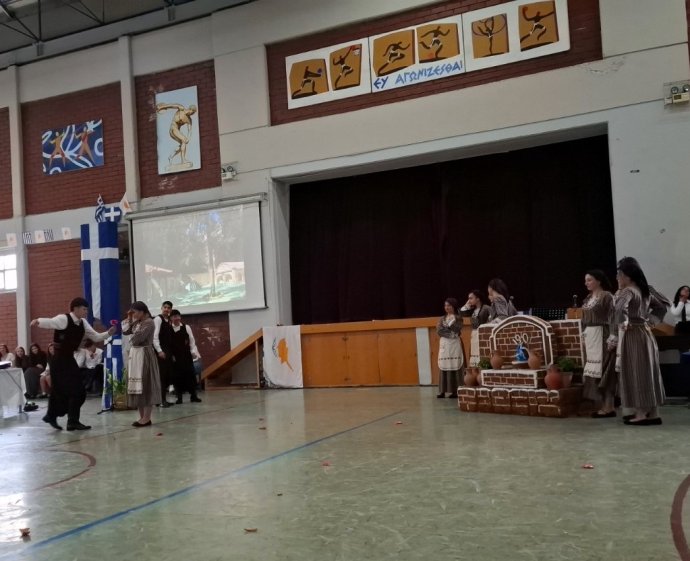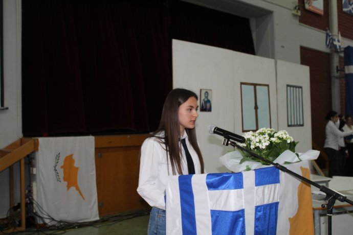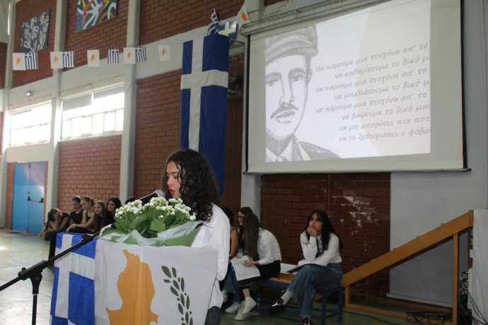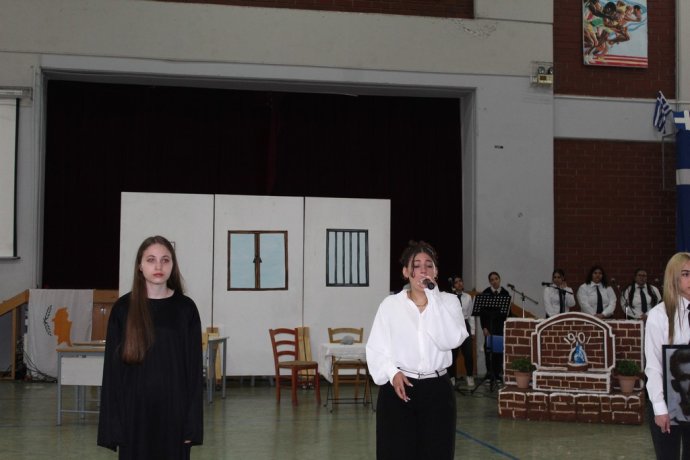 Ρίγη εθνικής υπερηφάνειας και συγκίνησης προκάλεσε σε όλους/όλες τους/τις παρευρισκoμένους/παρευρισκόμενες ο ενδοσχολικός εορτασμός της Επετείου της 1ης Αρπιλίου 1955, που πραγματοποιήθηκε στις 31 Μαρτίου 2025. Η πλούσια εκδήλωση τίμησε τον Αγώνα των ηρώων του 1955 – 59 και όλων των Ελλήνων και Ελληνίδων της Κύπρου, που στάθηκαν με παρρησία, γενναιότητα, αυτοθυσία και ηρωισμό απέναντι στον Βρετανό κατακτητή, για να πετύχουν τον τερματισμό της αγγλικής αποικιακής κατοχής. Ιδιαίτερα συγκινητικό ήταν το θεατρικό δρώμενο, που παρουσιάστηκε με την αναβίωση της τάξης του Ευαγόρα Παλληκαρίδη αλλά και των τελευταίων στιγμών του ήρωα. Απαγγελίες, τραγούδια από τη Χορωδία και Ορχήστρα του Σχολείου μας, χορογραφίες και παραδοσιακοί χοροί από το Χορευτικό μας Συγκρότημα διάνθισαν επιτυχώς την εκδήλωση αφήνοντας τις καλύτερες εντυπώσεις.