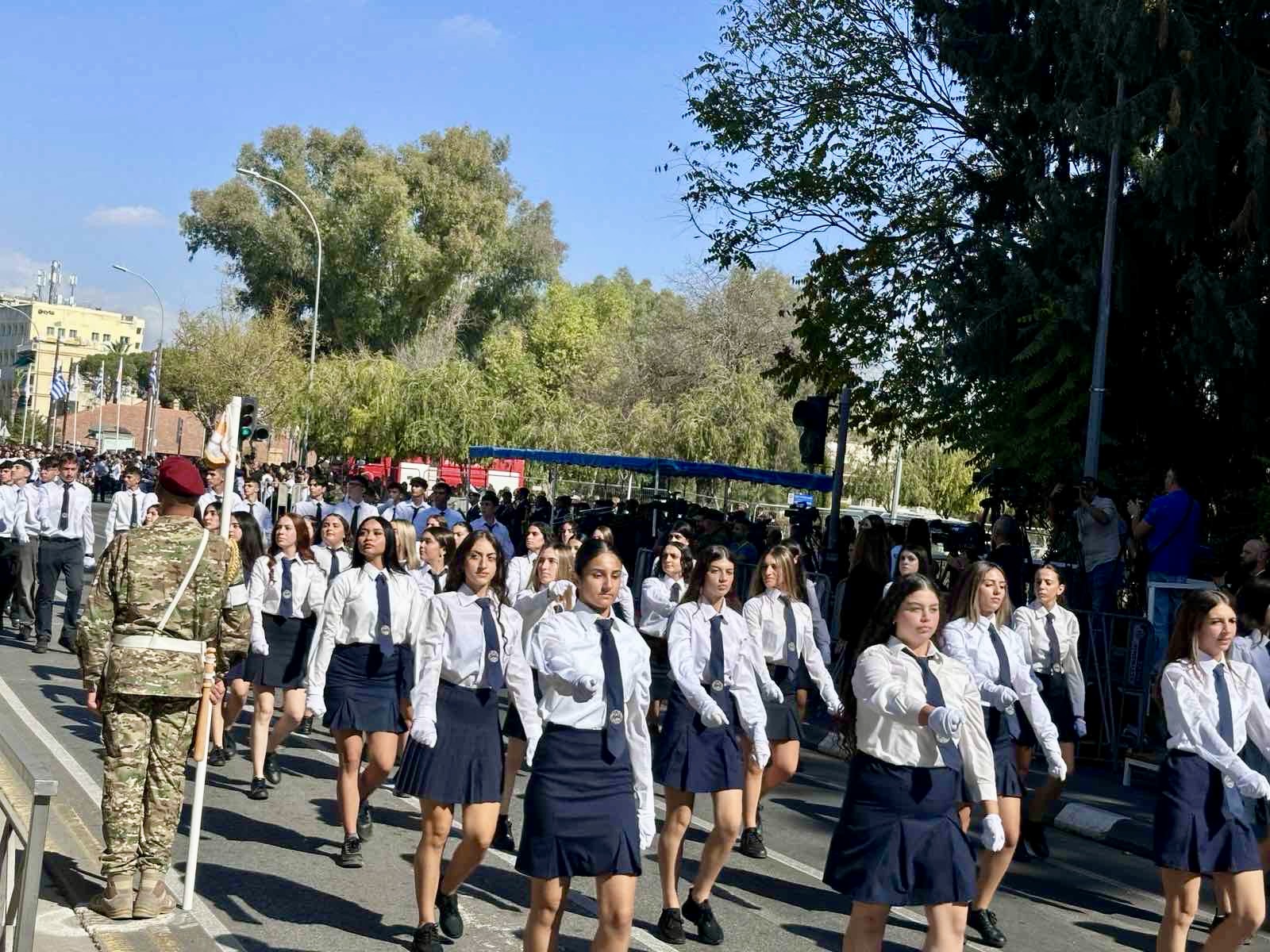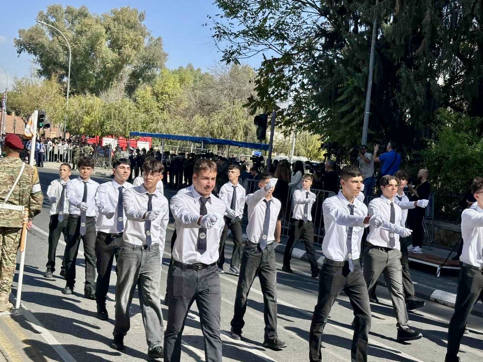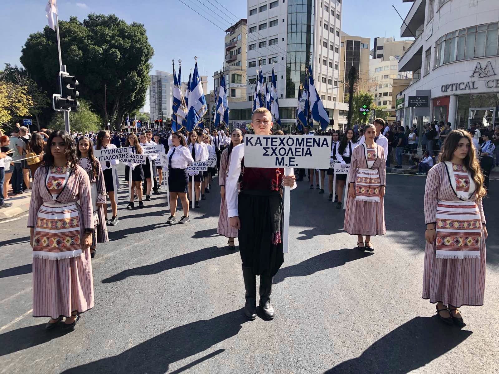 Μετά τη Δοξολογία, το Άγημα του Σχολείου και ομάδα μαθητών και μαθητριών συμμετείχαν στη μαθητική παρέλαση, η οποία πραγματοποιήθηκε μπροστά από το οίκημα της Ελληνικής Πρεσβείας στη Λευκωσία.