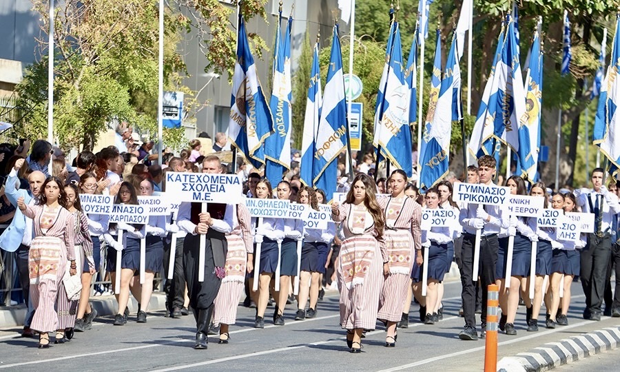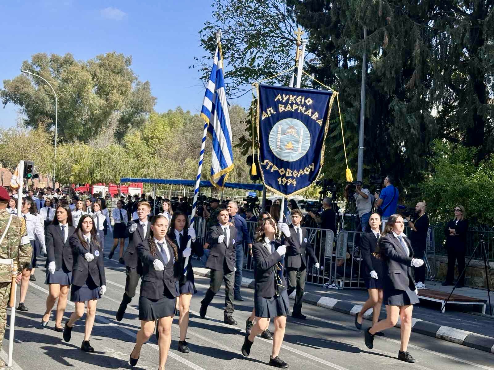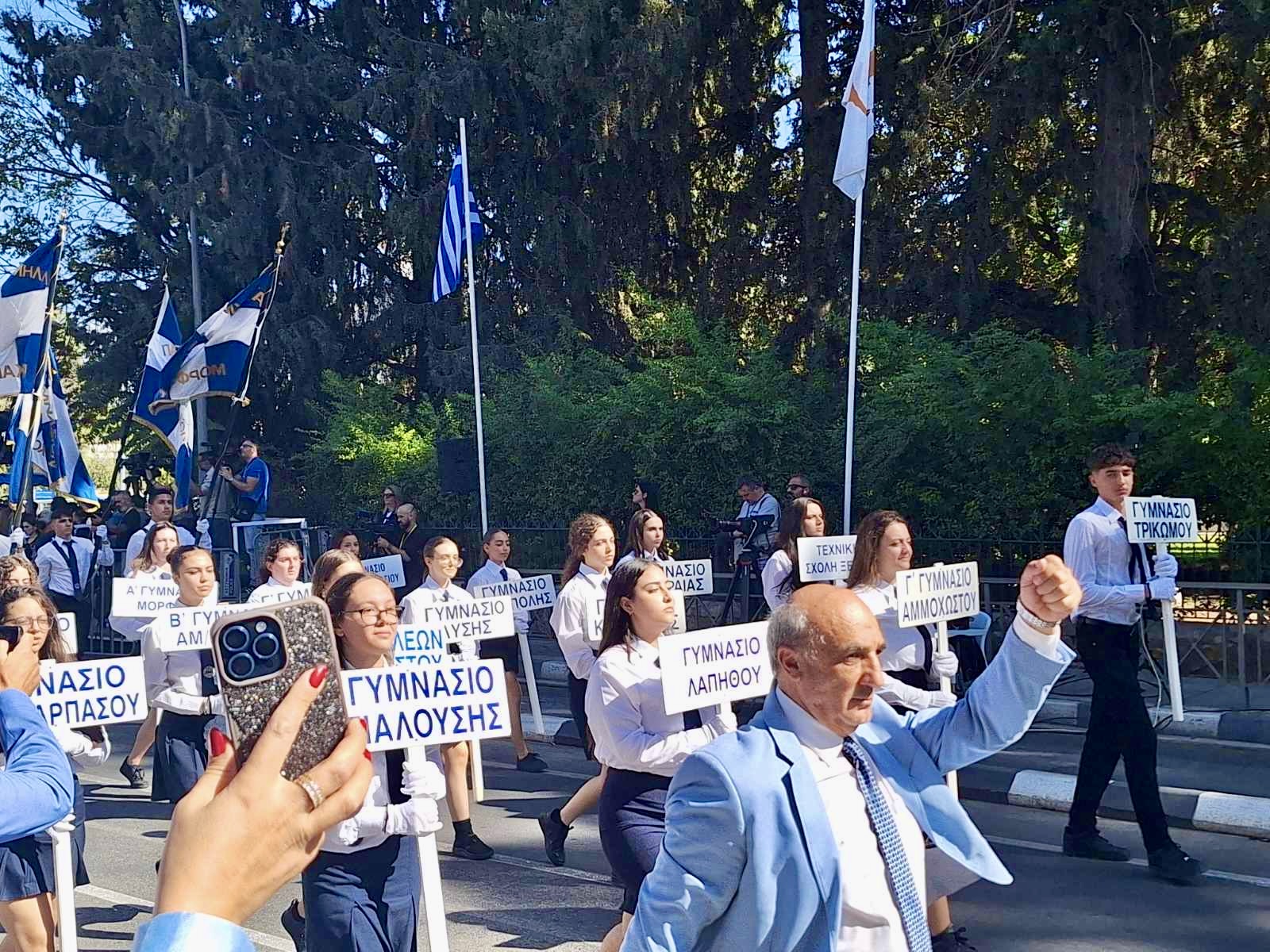 Μετά τη Δοξολογία, το Άγημα του Σχολείου και ομάδα μαθητών και μαθητριών συμμετείχαν στη μαθητική παρέλαση, η οποία πραγματοποιήθηκε μπροστά από το οίκημα της Ελληνικής Πρεσβείας στη Λευκωσία.