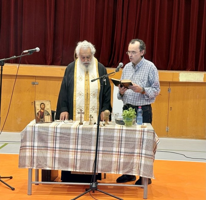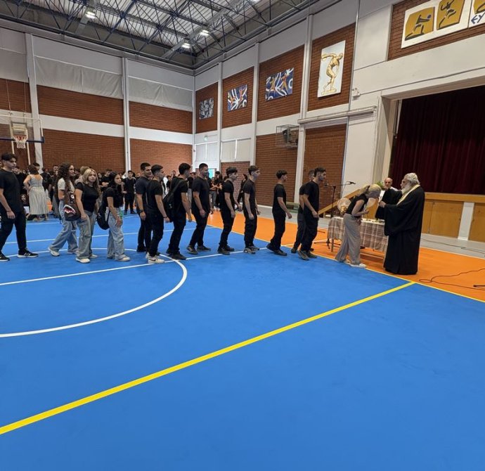 Την Τρίτη, 09 Σεπτεμβρίου 2025 πραγματοποιήθηκε στο Σχολείο μας ο καθιερωμένος Αγιασμός για την έναρξη της νέας σχολικής χρονιάς. Τον Αγιασμό τέλεσε ο π. Αντώνιος Καλογήρου, εφημέριος του Ιερού Ναού Αποστόλου Ανδρέα του Συνοικισμού «Στρόβολος ΙΙΙ», με τη συμμετοχή του Θεολόγου του Σχολείου μας, κ.Γιώργου Γεωργιάδη. Στη συνέχεια, η Β.Δ. κ. Φωτούλα Αδάμου Γεωργίου, ανέγνωσε το μήνυμα του Αρχιεπισκόπου Νέας Ιουστινιανής και Πάσης Κύπρου κ. κ. Γεώργιου και η Β.Δ. Α΄ κ. Βασιλική Παπαδάκη το μήνυμα της Yπουργού Παιδείας, Αθλητισμού και Νεολαίας, Δρος Αθηνάς Μιχαηλίδου.