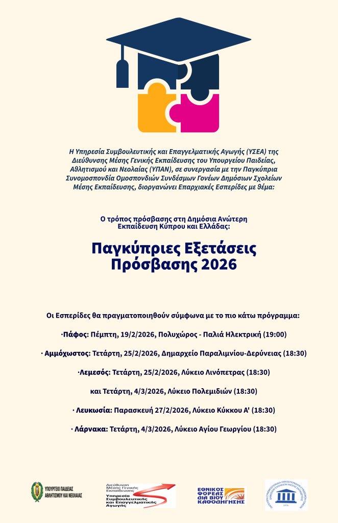 Η Υπηρεσία Συμβουλευτικής και Επαγγελματικής Αγωγής (ΥΣΕΑ) της Διεύθυνσης Μέσης Γενικής Εκπαίδευσης- ΥΠΑΝ σε συνεργασία με την Παγκύπρια Ομοσπονδία Συνομοσπονδιών Γονέων Δημοσίων Σχολείων Μέσης Εκπαίδευσης, οργανώνουν την πραγματοποίηση των καθιερωμένων Επαρχιακών Εσπερίδων για το πιο πάνω θέμα.