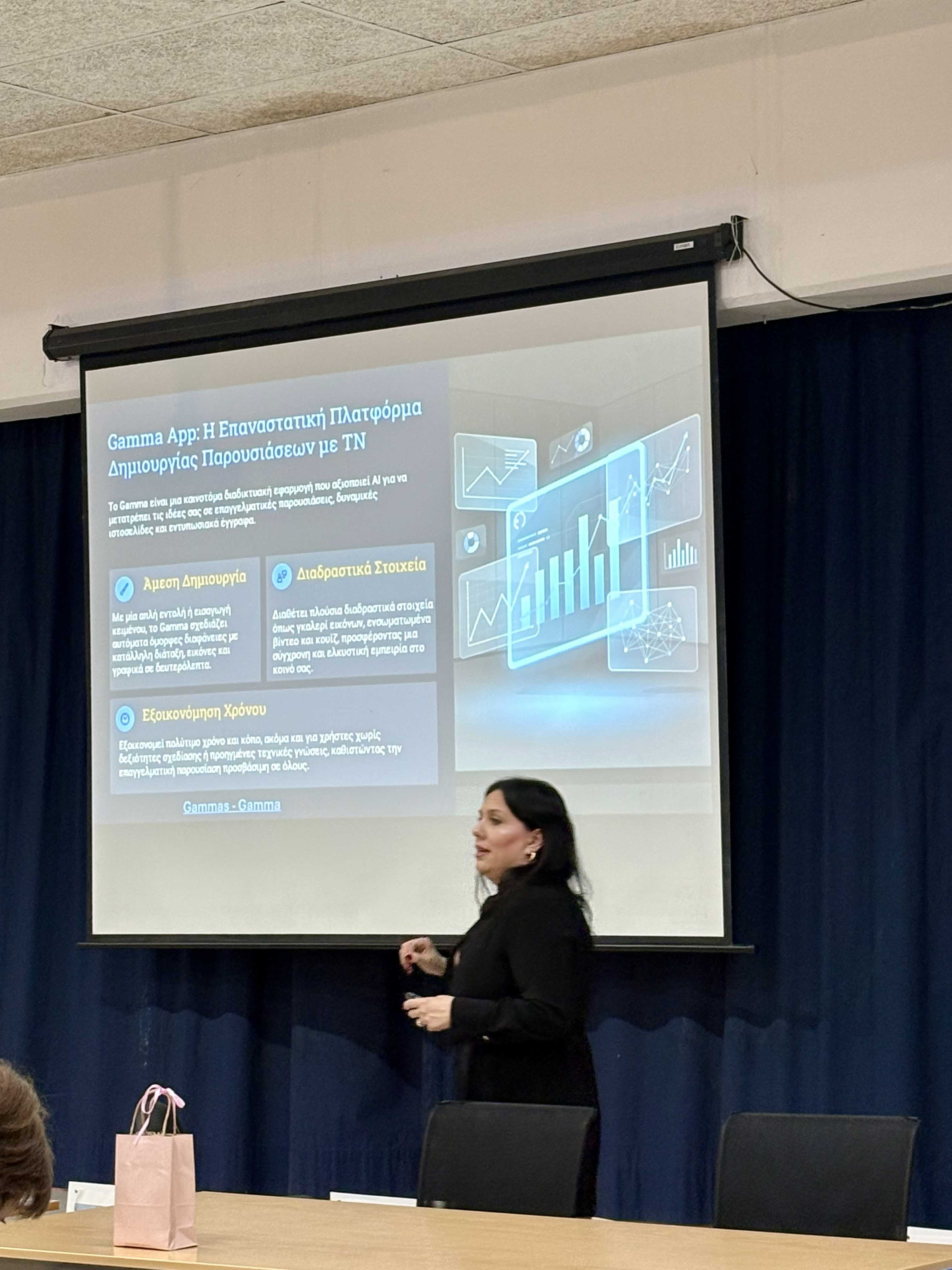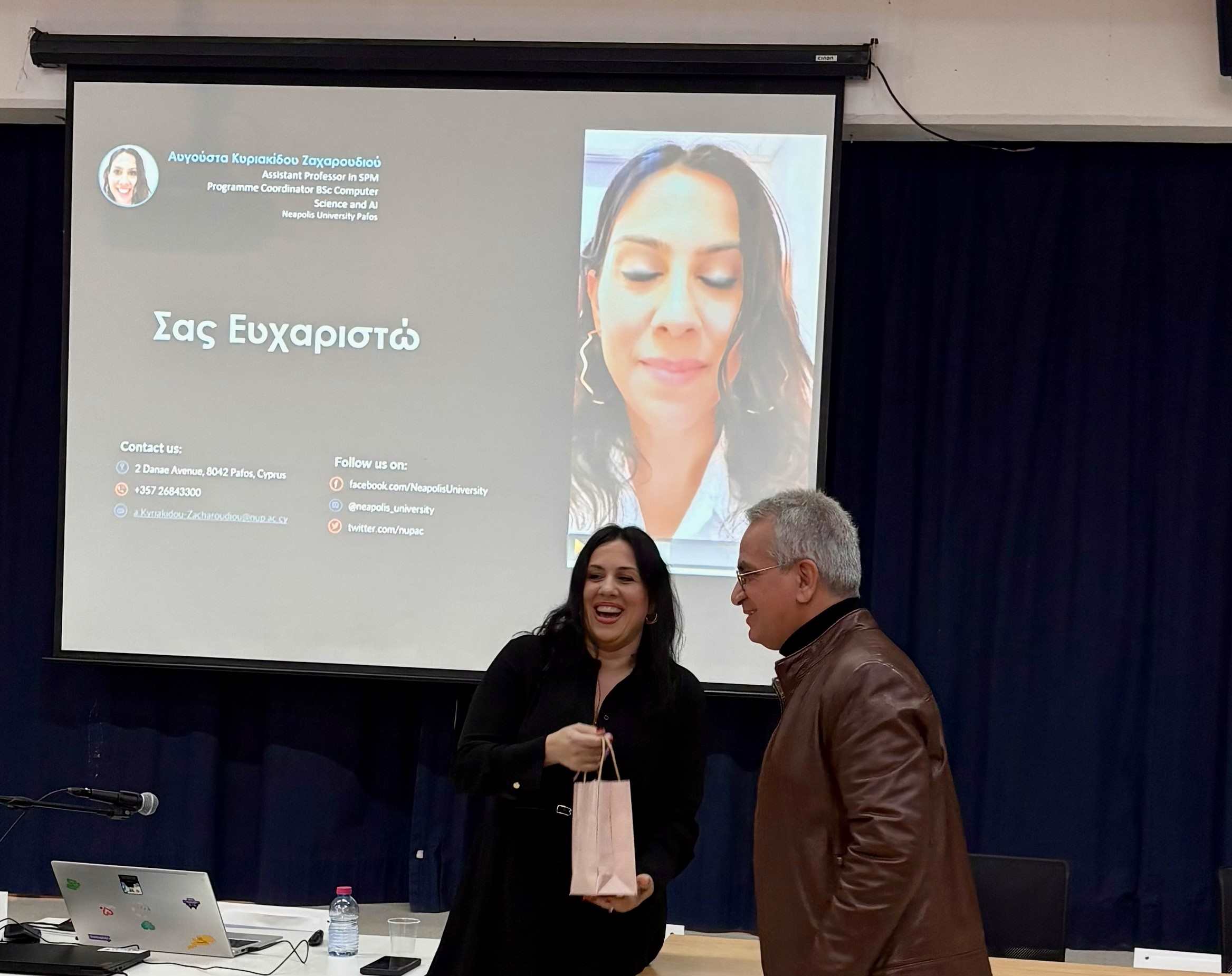 Η ημέρα ξεκίνησε με τη διάλεξη της Δρος Αυγούστας Κυριακίδου, Επίκουρης Καθηγήτριας του Πανεπιστημίου Νεάπολις Πάφου, με θέμα «AI: Πρακτικές εφαρμογές στην εκπαίδευση». Η εισήγηση ανέδειξε τις δυνατότητες αξιοποίησης της Τεχνητής Νοημοσύνης στη διδακτική πράξη, παρουσιάζοντας παραδείγματα και εργαλεία που μπορούν να ενισχύσουν τη μαθησιακή διαδικασία και να υποστηρίξουν το έργο του/της εκπαιδευτικού.