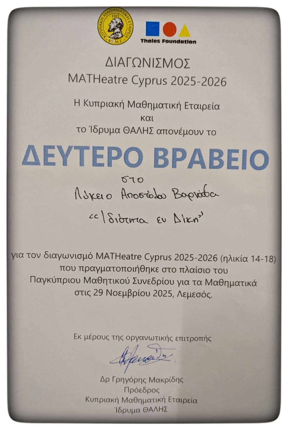Σημαντική διάκριση πέτυχαν οι μαθητές/μαθήτριες Γερμασογείτου Ιωάννα Α23, Καμπανέλλα Εβελίνα Α23, Μαντζουράνη Κασσάνδρα Α23, Νεοφύτου Δέσποινα Α21, Ξενοφώντος Νικόλας Α21 και Χρίστου Άλκηστις Α23, οι οποίοι/-ες, υπό την καθοδήγηση της κ. Ελίνας Βασιλειάδου, καθηγήτριας Μαθηματικών, κατέκτησαν το Β΄ Βραβείο στον Διαγωνισμό Μαθηματικού Θεάτρου MATHeatre CYPRUS 2025–2026.