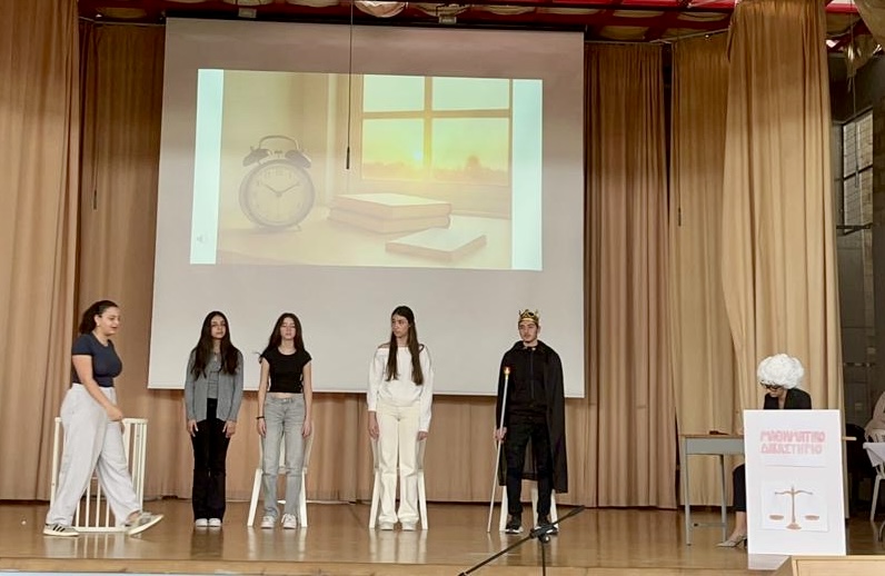 Με την παρουσίαση του θεατρικού έργου «Ιδιότητα εν Δίκη», οι μαθητές/μαθήτριες του Σχολείου μας απέδωσαν με ευρηματικό και δημιουργικό τρόπο μια μαθηματική έννοια, εντυπωσιάζοντας τόσο το κοινό όσο και την Κριτική Επιτροπή.