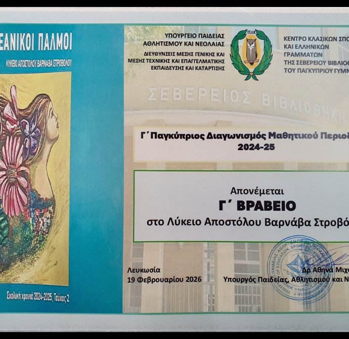Με ιδιαίτερη χαρά και περηφάνια ανακοινώνουμε ότι το μαθητικό περιοδικό «Νεανικοί Παλμοί», τεύχος 2, του Σχολείου μας απέσπασε το Γ΄ Βραβείο στην κατηγορία Λύκεια και Τεχνικές Σχολές, στο πλαίσιο του Παγκύπριου Διαγωνισμού Μαθητικού Περιοδικού για Γυμνάσια, Λύκεια και Τεχνικές Σχολές για τη σχολική χρονιά 2024-2025.