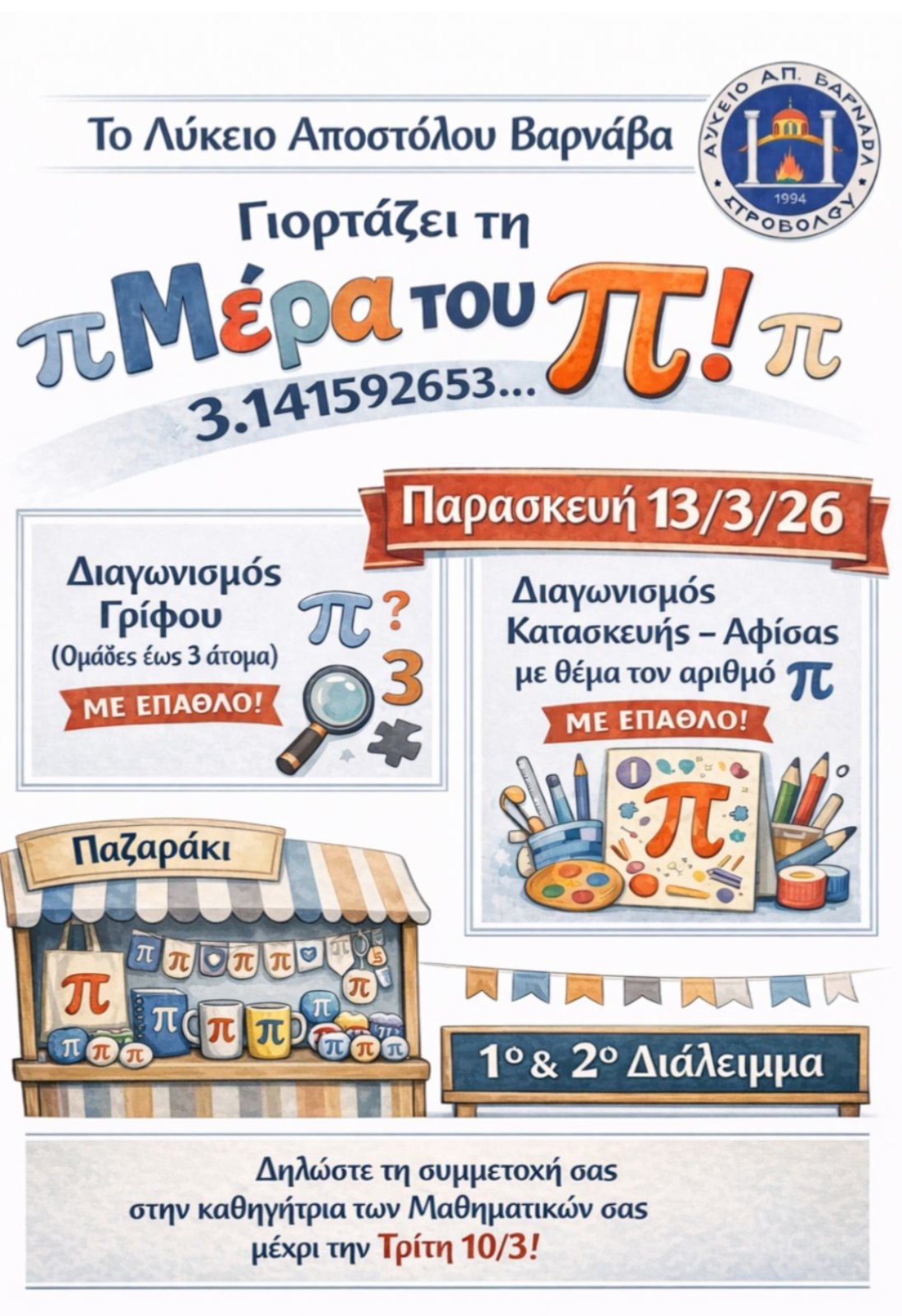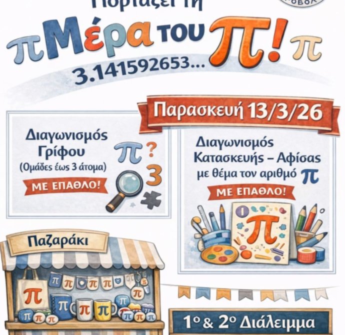 Την Παρασκευή, 13 Μαρτίου 2026, με αφορμή την Ημέρα του «π», πραγματοποιήθηκαν στο Σχολείο μας ποικίλες δράσεις, τις οποίες διοργάνωσε η ομάδα των Μαθηματικών. Ανάμεσα σ’ αυτές περιλαμβάνονταν Διαγωνισμός Κατασκευής και Δημιουργίας Αφίσας, Διαγωνισμός Επίλυσης Μαθηματικών Γρίφων, καθώς και παζαράκι με προϊόντα εμπνευσμένα από το π. Η Ημέρα ήταν γεμάτη μάθηση, χαρά και ενδιαφέρουσες προκλήσεις, που έκαναν τα Μαθηματικά ακόμη πιο προσιτά και διασκεδαστικά για όλους κι όλες.