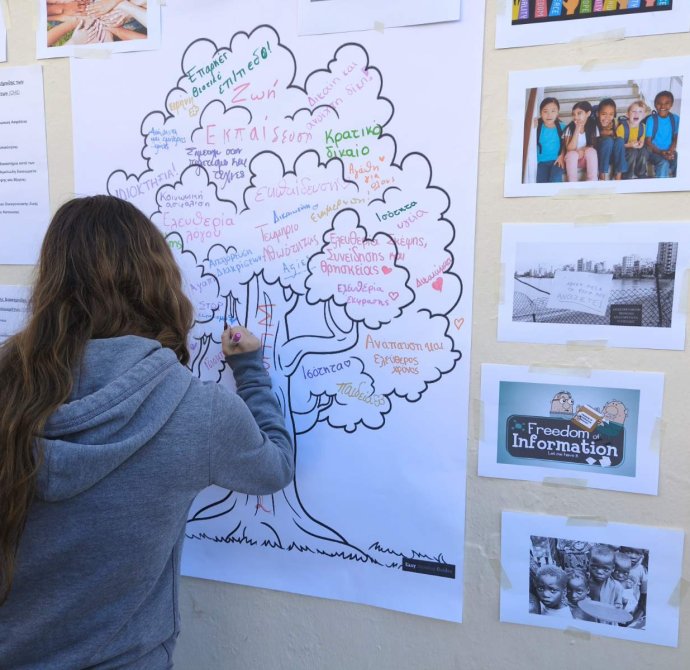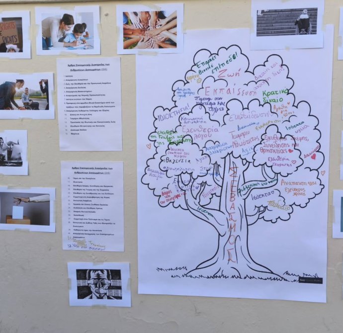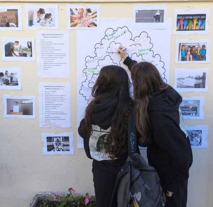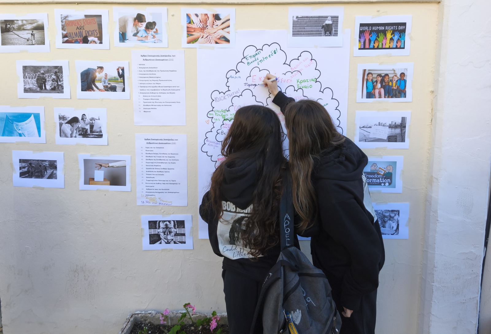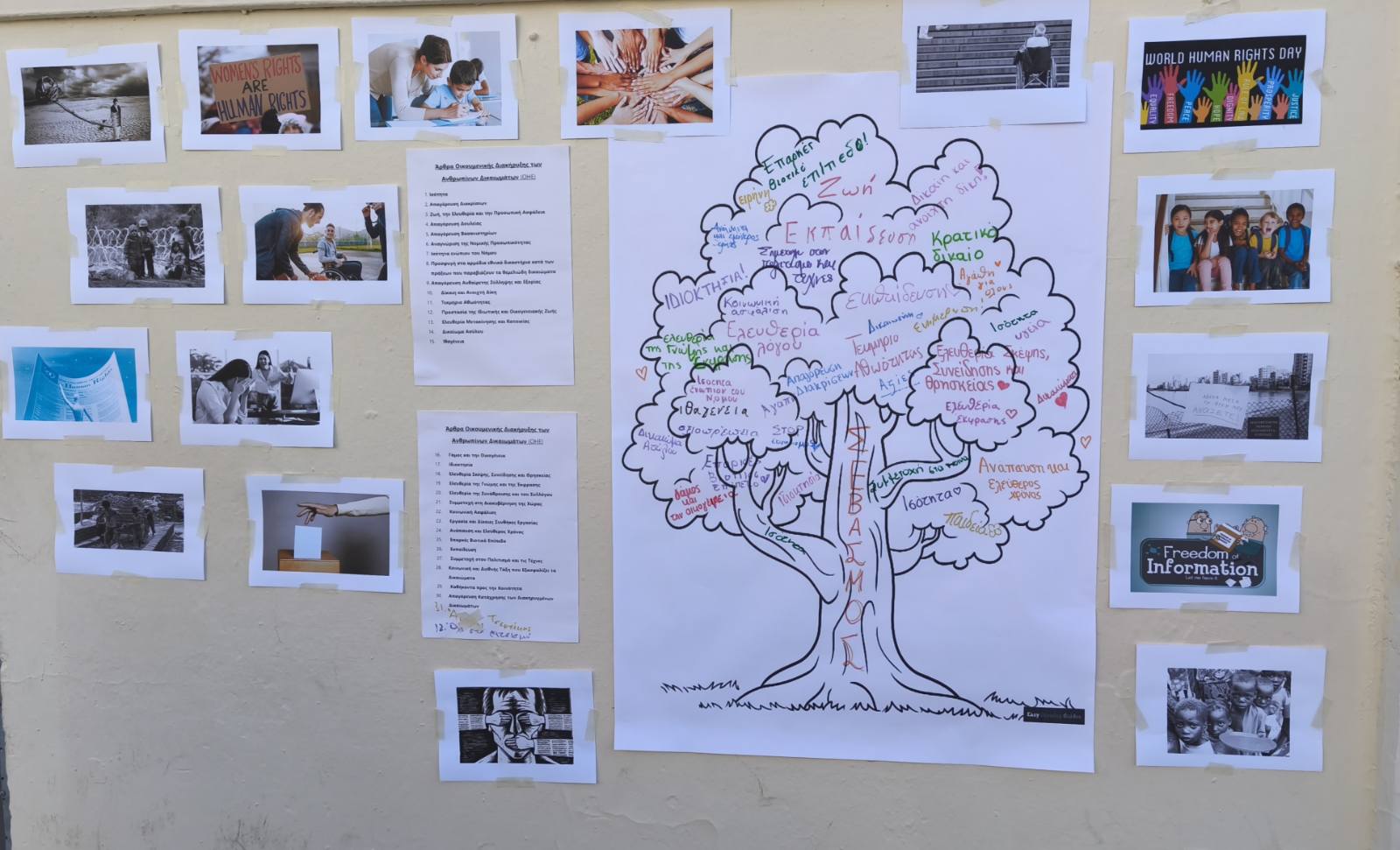 Με αφορμή τη 10η Δεκεμβρίου, που έχει οριστεί ως η Παγκόσμια Ημέρα Ανθρωπίνων Δικαιωμάτων, την Τρίτη, 16 Δεκεμβρίου 2025, οι δόκιμοι/-ες πρεσβευτές/πρέσβειρές μας, κατά τη διάρκεια των διαλειμμάτων, κάλεσαν τους/τις συμμαθητές/συμμαθήτριές τους να συμμετάσχουν ενεργά γράφοντας βασικά ανθρώπινα δικαιώματα στο «Δέντρο των Ανθρωπίνων Δικαιωμάτων» και απαντώντας σε ερωτήσεις σχετικές με το θέμα. Μέσα από τη δράση, ενισχύθηκε η ενημέρωση και η ευαισθητοποίηση γύρω από αξίες, που αποτελούν θεμέλιο μιας δίκαιης και δημοκρατικής κοινωνίας.