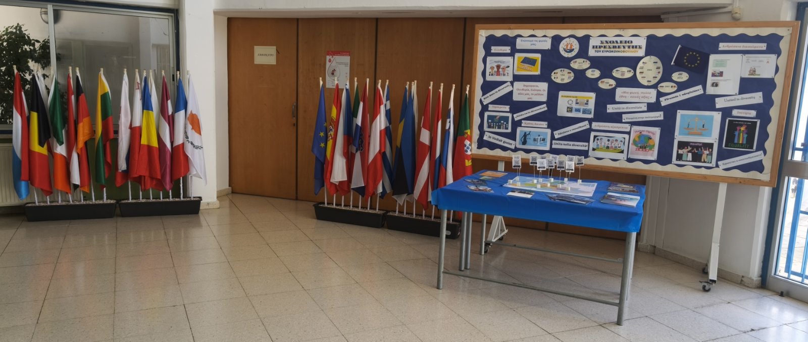 Στην Είσοδο του Σχολείου μας, οι μαθητές/μαθήτριες του Προγράμματος δημιούργησαν με ενθουσιασμό ένα Info - Point, το οποίο αποτελεί έναν ζωντανό χώρο ενημέρωσης για την Ευρωπαϊκή Ένωση. Ο χώρος αυτός περιέχει φυλλάδια, αφίσες και ενημερωτικό υλικό σχετικά με τις αξίες, τις πολιτικές και τον ρόλο της. Αξιοπρόσεκτο στοιχείο στον χώρο αυτό είναι ο χάρτης των χωρών της Ευρωπαϊκής Ένωσης με τους κωδικούς άμεσης ανταπόκρισης (QR codes), μέσω των οποίων οι μαθητές/μαθήτριες μπορούν να ανακαλύψουν πληροφορίες για τα 27 κράτη - μέλη της. Την παρουσίαση συμπληρώνουν και οι 27 σημαίες των κρατών-μελών, τονίζοντας την ευρωπαϊκή ταυτότητα, την πολυμορφία και την ενότητα των λαών της Ευρώπης.