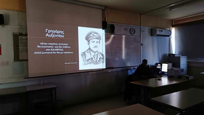 Το Σχολείο μας τίμησε τον ήρωα Γρηγόρη Αυξεντίου σε ενδοτμηματική εκδήλωση την Παρασκευή, 28 Φεβρουαρίου 2025, στην οποία οι ηχογραφημένες αφηγήσεις και απαγγελίες των μαθητών/-τριών μας ζωντάνεψαν τον θρύλο των βουνών της Κύπρου. Σε μια εκδήλωση για τον Αυξεντίου δεν θα μπορούσε να απουσιάζει η μάνα του, η Αντωνού. Παράδειγμα Ελληνίδας, που όχι μόνο προσέφερε το παιδί της στον βωμό της ελευθερίας αλλά του έδωσε και την ευχή της, όπως έγραψε σε ποίημά της, το οποίο απήγγειλαν μαθητές/-τριές μας.