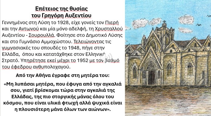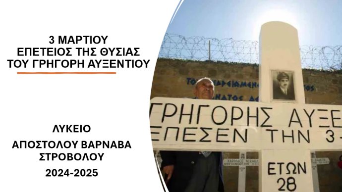 Η ιστορική πορεία της Κύπρου βρίθει λαμπρών περιόδων και ένδοξων στιγμών, που έγραψαν οι ήρωές μας αγωνιζόμενοι για τη λευτεριά, την αξιοπρέπεια, τα ιδανικά της πατρίδας και τα σύμβολα του έθνους. Μια τέτοια λαμπρή και άγια μορφή είναι και ο ήρωας της ΕΟΚΑ Γρηγόρης Αυξεντίου, του οποίου τη μνήμη τιμούμε στις 3 Μαρτίου, ημέρα θυσίας και ανόδου του στο βάθρο των αθανάτων.